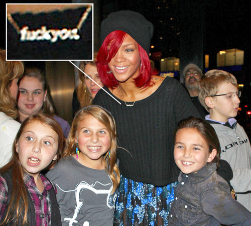 The written word is not Rihanna’s friend. Here, she poses with children while wearing a necklace that says “Fuck You.” Don’t you hate it when adorable children interfere with your badass ‘tude?